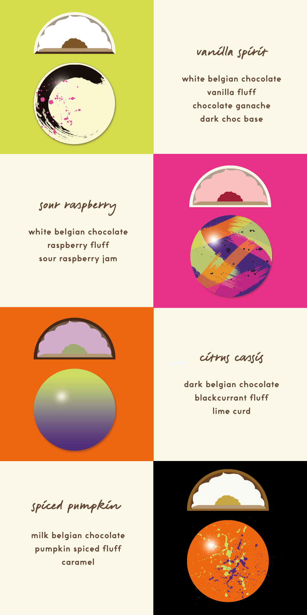 Vanilla Spirit – deep vanilla marshmallow fluff, a rich chocolate ganache , finished in a glossy white chocolate shell.