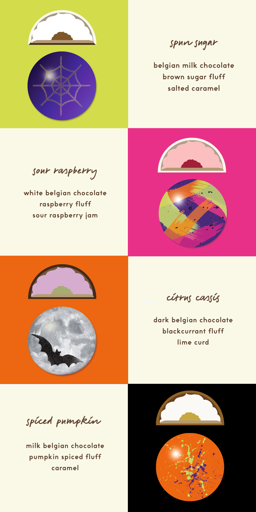 Vanilla Spirit – deep vanilla marshmallow fluff, a rich chocolate ganache , encased in a moonscape with spooky bat.